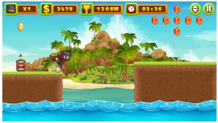 Description:Ninja Run – it’s amazing and cool game in which you play as a ninja who has set a goal to be the very steep and collect as many coins, gold and jewels as possible. How much you will be able to run? Be careful because in your way will be dangerous jumps, thorns and bombs. Prove that you are the best ninja! PC controls: Mouse, Keyboard. Touch Control works on all browsers and all mobile devices!