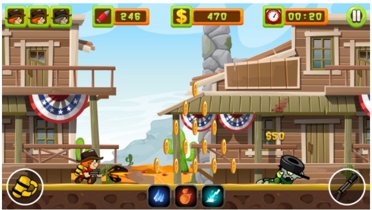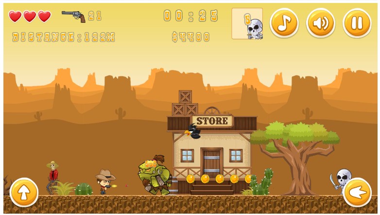 Description:Super Cowboy Run, is a fascinating and beautiful game in which you must collect coins, lives, ammunition and kill monsters, and go as far as possible! Simple controls: jump up, pressing the up arrow, shoot by pressing the Space or touch the screen to mobile devices.