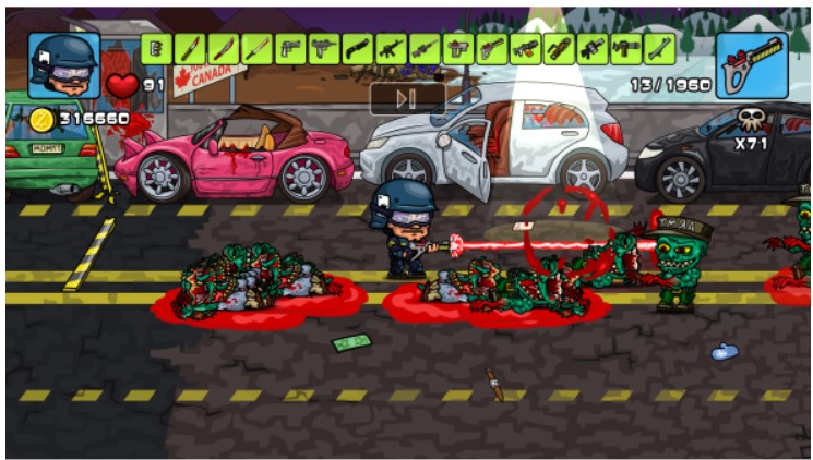 Description:SWAT VS ZOMBIES – a really cool game about a guy who alone decided to get to the den of zombies and conduct a hard war there. Buy weapons in the store and shoot a zombie from 16 types of weapons. This game has 5 levels with a gradually increasing degree of complexity, and the game is ideally suited for mobile devices.PC controls: Move – W,A,S,D & Arrow keys. Shoot – Spacebar. Recharge – R. Touch Control works on all browsers and all mobile devices!